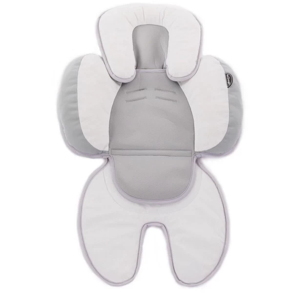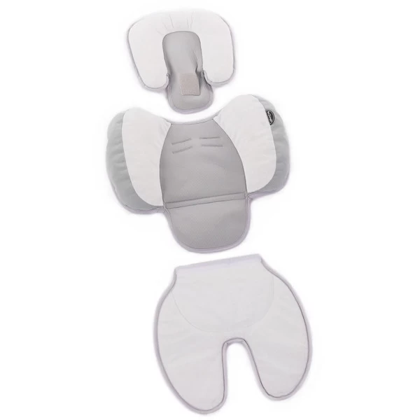 De hoofdsteun kan aangepast worden naarmate de baby groeit en de luchtdoorlatende stoffen bieden extra comfort en veiligheid in alle seizoenen. Het kussen heeft openingen voor veiligheidsgordels en het onderste deel is waterdicht voor bescherming bij luierongelukjes.