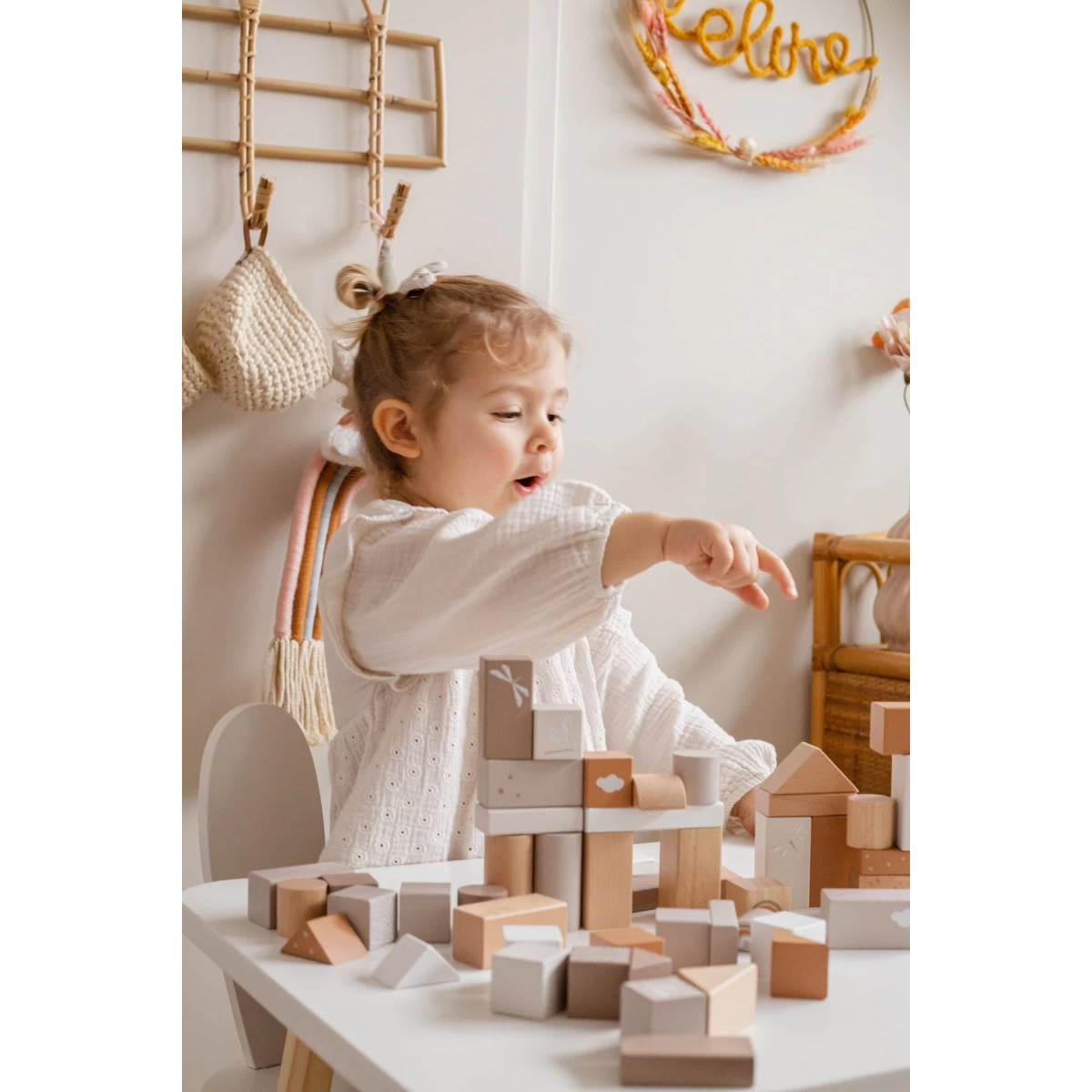 Wat een bouwplezier met deze blokkenset van Label Label! Je kindje raakt niet uitgespeeld, want de set bestaat uit maar liefst 50 stuks blokken! De toren kan meerdere manieren in elkaar gezet worden. De blokken hebben een mooie nougat kleur en zijn voorzien van verschillende figuurtjes.Â