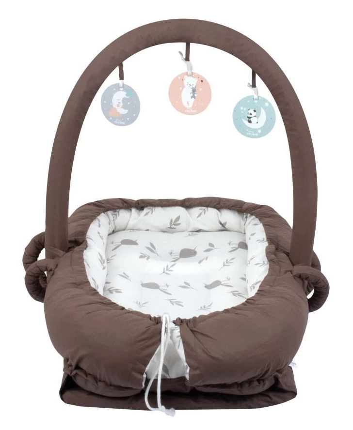 Het nestje heeft een ergonomische vorm. Je kleine zal zich niet snel vervelen, hij is namelijk voorzien van een speelboog met drie schattige kaartjes. Uiteraard is het ook mogelijk om andere speelgoedjes (niet inbegrepen) te bevestigen aan de speelboog. Tevens heeft hij een ruim muskietennet, dat je kindje beschermt tegen insecten. De hoes is gemaakt van 100% katoen en is afneembaar zodat je hem kunt wassen.