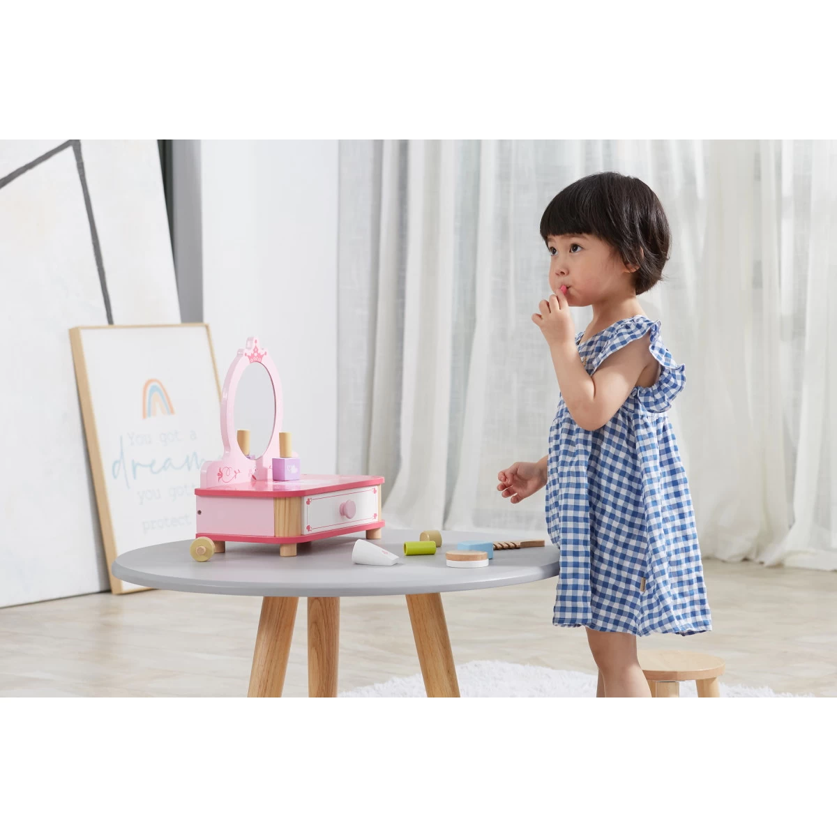 De verschillende accessoires zoals een kam, lippenstift en verschillende potjes en tubes laten de fantasie van jouw kleine dame lekker gaan. Het leuke kaptafeltje maakt deze make-up set compleet! De kaptafel heeft een spiegel waarin je kindje zichzelf kan zien en een lade om wat spulletjes in op te bergen.Â