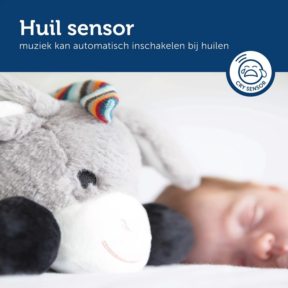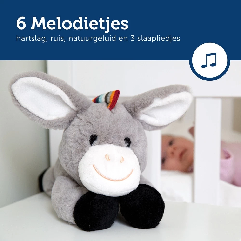 Met dit leuke kalmerende Ezeltje van Zazu zal je kindje heerlijk slapen! Deze leuke zachte knuffel, die vast te maken is aan de box of het bedje, produceert zes verschillende geluiden. Vier rustgevende melodietjes, het geluid van een waterval en het geluid van een hartslag die van de moeder is nagebootst.